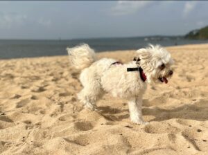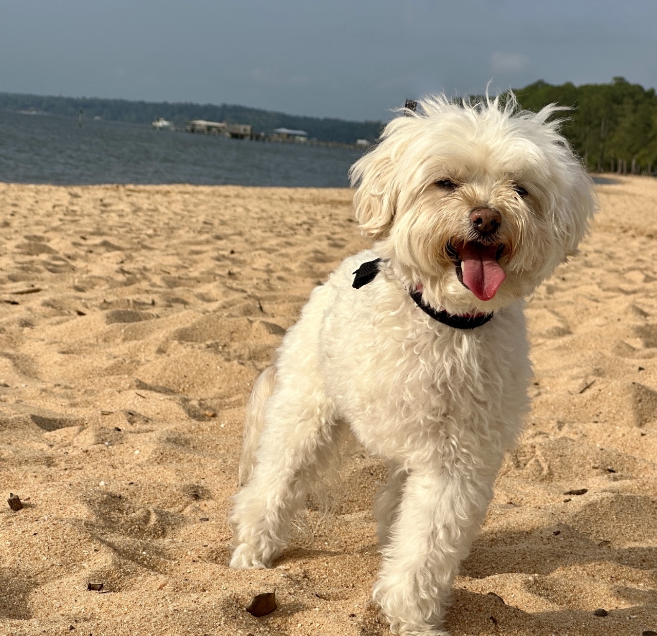“Clover just turned ten. That is seventy in dog years. She broke her front leg and had several surgeries but kept re-breaking it. The doctor put in a metal rod, and she broke that too. Three years ago, the doctor said, ‘Forget it; we are going to amputate the leg.’ She has been a new dog ever since – she just needs a little help going up and down stairs. Clover is still a boat dog and loves going out on the water. She makes people feel good, and everyone wants to meet her.”