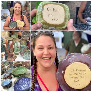 “I started Sticky Fingers pottery six years ago so I could homeschool my two kids. My dad is a potter. My grandmother had Alzheimer’s and I was taking care of her at home. I needed something to do to pass the time so I started making pottery. It became my career. Every piece has a message on the bottom. The words started out sweet, but I put more of myself and what I felt on there hoping people would accept it. The message and colors reflect the mood of the day. If I am feeling good, it will be something pretty. If I am feeling crappy, that comes out too. I try not to replicate myself. Sometimes it is lyrics to a song I am listening to as I work. ‘Pay it forward’ is how I live my life. ‘No one is too old for fairy tales’ is when I am proud of my marriage and everything is working. ‘Aw Shit’ was when we had a bad day. I was feeling good about that pretty bowl when I glazed it, but on the bottom is ‘If I wanted to listen to an asshole, I would fart.’ Someone had come to the house who I didn’t appreciate much and that came out in the message.