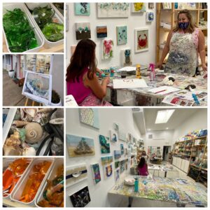 I use mixed media with glass and resin. We have abstract painting nights that don’t require a lot of attention to detail. We offer classes from child to adult. We started after school adventures in art class this year, but had to take it online.