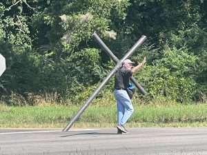 In 2017, the mayor of Uniontown asked me to carry the cross around his city. My wooden cross weighed 65 pounds. I hurt my back, and my chiropractor said I had to get a lighter cross. The one I carry now is made out of PVC pipe and weighs 24 pounds.
