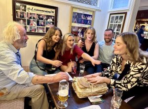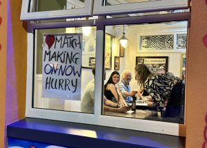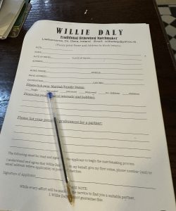 The Matchmaking Festival in Lisdoonvarna is four weeks in September. About 60,000 people come to our small town during the festival month, and I am making matches in my office in the Matchmaker Bar. People fill out the matchmaking forms with interests, hobbies, and preferences. Timing is important, and I try to introduce people on the spot. If that doesn’t work, we will contact them with a match over the next 12 months.