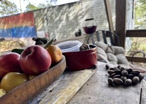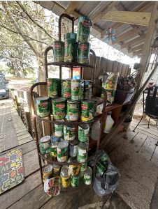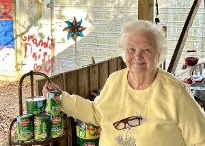 I take food at least once a week to people in Mobile. Yesterday I made potato salad and cooked two pies and took them to three people. I take meals to folks who are sick or have been in the hospital. The canned goods on my front porch are my food pantry. I take food to whoever needs it, or they come here and get it.