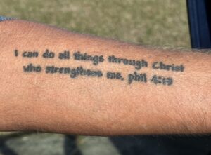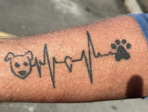 These two tattoos tell my story. The heartbeat is dedicated to Rosa, an old dog I rescued. She was broken and defeated when I found her, but I loved her back to life, and we had an amazing two years together. The other is: ‘I can do all things through Christ who strengthens me.’ My mother put that Bible verse in my lunch box every day. She can’t tell me those words anymore, but they are always with me. Helping others—humans and animals—gets hard, but it gives me strength.”