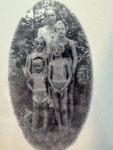 “Once my family was going swimming in the bay. A man asked to take a picture of us for a dollar. Mama looked in her little purse to find one. My eyes were closed in the picture–I had measles and couldn’t see. Buddy was five, and I was seven. Wilma Olean was nine. Elsa Joyce was twelve.  Mama was thirty-six. A year after that, she was dead. Buddy and I would become ‘almost orphans’ in Fairhope. That picture is the cover of my book.