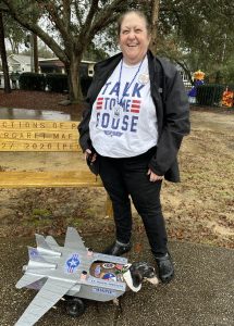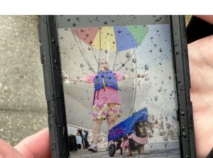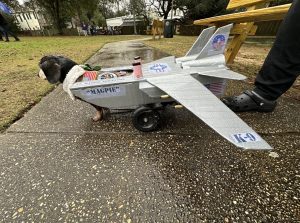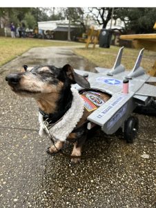 We have been walking in the Mystic Mutts parade in Fairhope for several years. Our first costume was Meals on Wheels. Another year we were parasailers—Maggie was the boat pulling me.