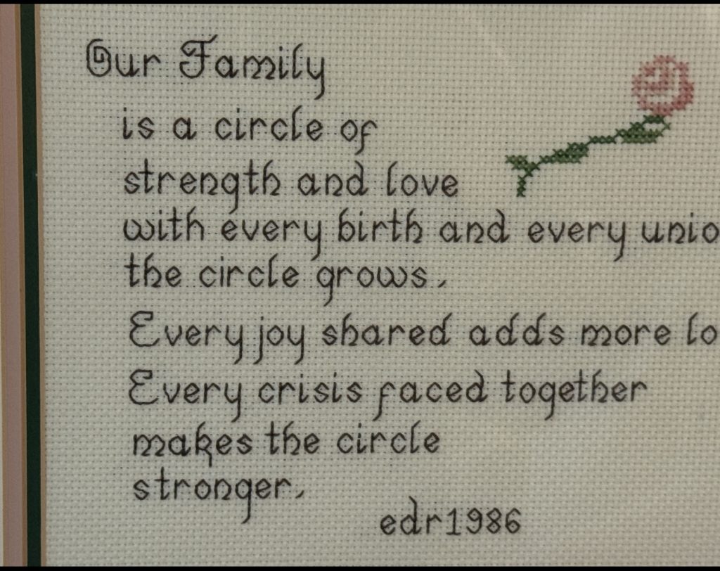 George has been gone for twenty-five years, and I still miss him. My son’s wife made this sign hanging on my wall. ‘Our family is a circle of strength and love with every birth and every union. The circle grows. Every joy shared adds more love. Every crisis faced together makes the circle stronger.’