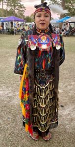 “I am from North Dakota and now live in Houston. My family travels and dances from May through December or January once or twice a month. This keeps us strong as a family. This Jingle Dress is a prayer dress for a sacred dance of prayer. It originated in the Ojibwe tribe in the early 20th century. There is a story about a man who had a sick wife and in a dream women danced around her. They jingled as they danced. When he woke up, his wife was better. He had the idea to roll tobacco leaves to make the jingle sounds. There are traditions and meanings in our dresses, but there are also trends. There is contemporary and traditional jingle dance. I pray to my grandmother every time I dance. Sometimes I can smell her and feel her.