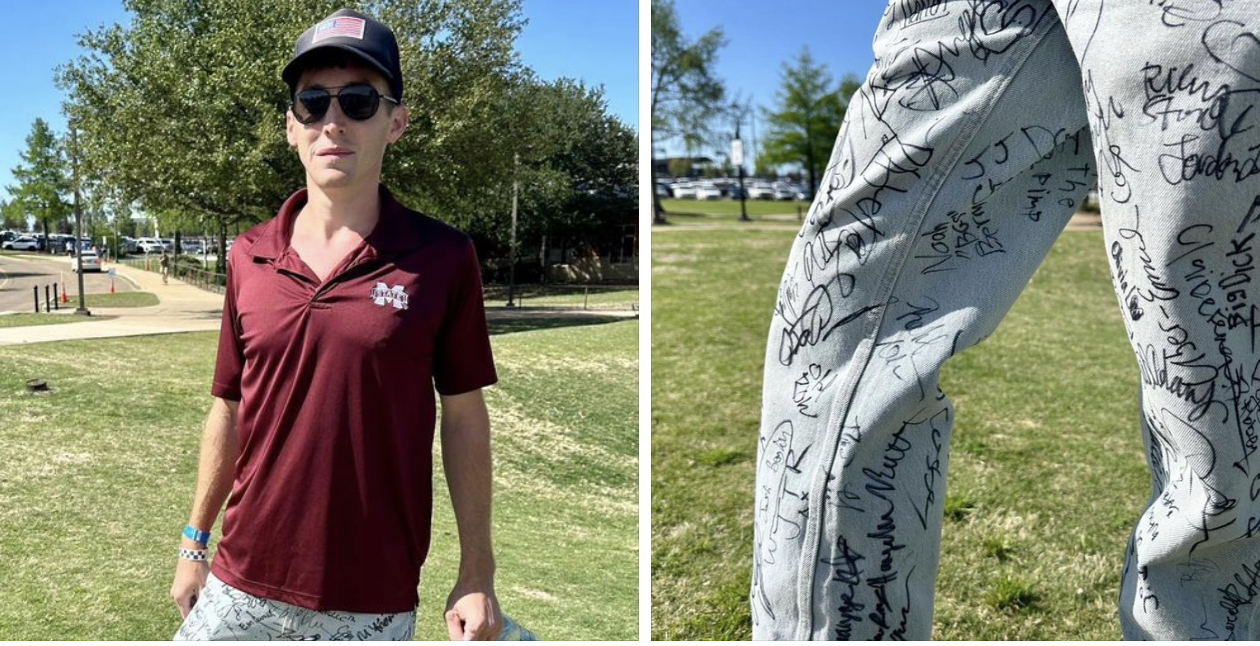 “I turned 30 this year. That was a big birthday, and I wanted to do something special. I saw a video of a guy getting his friends to sign his pants, and I thought it would be a cool way to meet people. It went crazy, and many signatures are from random strangers who walked up and wanted to sign. These pants are famous. One day I will frame them and hang them on the wall.”