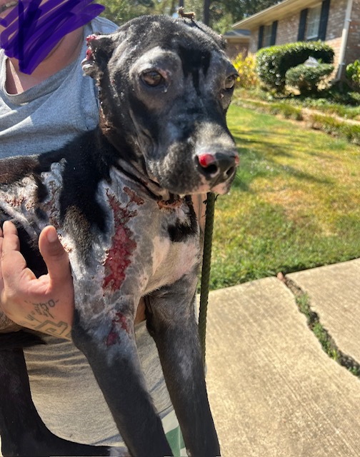 Another is Genesis. Someone shot her. Don’t let the wheelchair fool you—she can run. Someone found her bleeding in a pawn shop parking lot. The vet said the bullet missed her spine. She still has feeling in her legs and trying to put weight on one, so we’re hopeful she’d get it back. We used to have a standard poodle she loved. Every time she saw him, she’d flip her cart trying to get to her boyfriend.