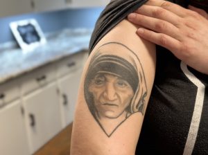 My tattoos became a part of my story. Before I broke my leg, I got Mother Teresa on my arm because she was a real woman helping and loving people every day. During my leg and eye problems, I sat in many waiting rooms with older people—my tattoo was an icebreaker. One man told me to cover it up because Mother Teresa was staring at him, reminding him about things he needed to confess. Another asked if he could touch my tattoo for good luck. It was a little laughter and connection during anxious times.