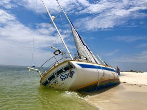 I washed up here a month ago. I had been out there for 30 days and anchored here to come ashore and be around people and talk to someone other than myself. I played some guitar around here, too. The shackle broke on the anchor and the boat washed up on on the beach. The hull is full of sand right now, but it is still seaworthy. Someone was going to help me get it off the beach, but the city and politicians have gotten involved.