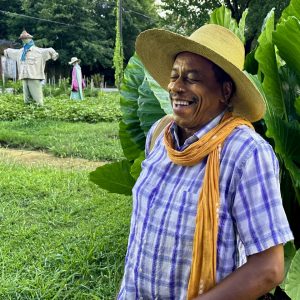 I’ve had anxiety most of my life, but I bring the jolly at the same time. A few years ago, my anxiety brought me to a breakdown. I found consolation in flowers and plants such as loofah. I gave loofah seedlings to the Bush Hills Community Garden. April Muhammad, the summer camp facilitator, invited me to the harvest to demonstrate the cleaning process with the children. Soon after, I started a garden adjacent to my studio and home in the West End neighborhood of Birmingham. April named it Sacred Space Garden. The purpose was for children to plant the garden, and everything would be free for the community.