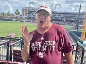 Candyman started in 1998. We went to Texas for a super-regional and met some nice Aggie fans who took care of us that weekend. The next year, they came for games in Starkville and brought three bags of candy. They told me to pass out the candy, but I thought that was weird. They kept after me. Finally, I stood up and asked, ‘Does anybody want any candy?’ People started hollering for candy, even from the skyboxes. It kept going from there. I was careful and just gave candy to the parents and kids that I knew. Then it circulated that it was okay to take candy from the Candyman. I give out Tootsie Rolls, Dum-Dums, butterscotch and Jolly Ranchers—things that can’t melt. I can’t believe I’ve been giving candy out this long.