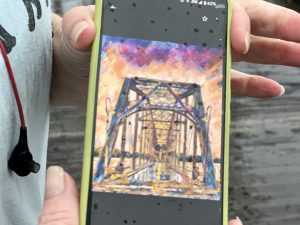 “I am taking pictures in the rain of the bridge in Chattanooga for inspiration. I started painting a year ago. I was diagnosed with COVID the first week of January and couldn’t sit still for ten days. I got out my daughter’s Walmart paints and tried something new.