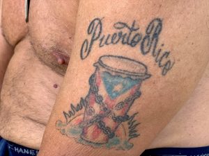“I moved from New York to Puerto Rico when I was in 11 and went to high school there. I was drafted and went to Vietnam in 1970. I did my time and I realized I could make a career out of the Army because I had already been through the worst. I went back and stayed in for 25 years. My tattoo is the flag of Puerto Rico on a conga in chains. It represents the African slaves who brought the bongos and their music to Puerto Rico. When I went to Iraq, I was in a unit with no Spanish people, so I got a tattoo that was part of my culture and identity. I came back to Puerto Rico because this is my home.