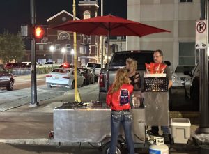 I got a little cart with a big red umbrella and set it up at Tricentennial Park. I saw many of my kids and parents from school, and it went better than I expected. I got my process down and started taking my cart downtown.