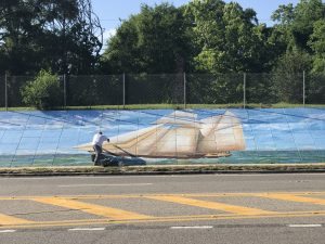 I started by making a pattern for it on paper. The ship is as wide as it is tall and I had to cheat because I only have 15 feet of wall, it looks shorter because of the slant. I had to improvise to make the ship look more dynamic and finally got it right on the pattern and put it on the wall. As soon as I got it up there, about five big trucks came flying through and knocked the pattern down. I had to get my yardstick and chalk and freehand everything. It knew how to do it, it just took a little more time. I didn’t want to have to guess on anything. Looking at it, you don’t realize how physical painting that wall is, but the wall is slanted and I had to lay my ladder down and push away to paint. I pushed away with my left hand and painted with my right hand and pushed away with my right hand and painted with my left hand. I kept moving the ladder from side to side and that was stressful and hard on my arms and legs. I could only work on 2 feet of area at one time and I am used to working on 3 or 4 feet at once. If the wall had been vertical, it would have been much easier. This is an important project for me and but I am 63 and wish I could have done this in my younger years so I could handle the physical part better. People have loved it and honk when they drive by. Most people have never seen a live person painting before.