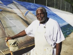 “I started this project about two months ago. The people of Africatown committee saw the work I did in the past and chose me to work on this project. I made a living doing murals and backgrounds for Olan Mills, Lifetouch and School Pictures Incorporated. I got up in age and can’t do it on a regular basis anymore. Painting this mural of the Clotilde is an honor and means a lot to me because this might be one of the ships that my ancestors came on. My last name is Lewis and Cudjoe Lewis is the last slave that came on this ship so I feel like we might be related.