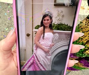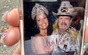 Deanna: “The attention is fun, but I panicked at the ball. We were behind the stage for callouts. It was my turn. I told my dad I was about to vomit. I couldn’t walk out and do this. He said, ‘Straighten up. Do you know how much money you’re wearing right now?’ Then boom. The lights come on. The curtain opens. I was okay, but I was dragging a 19-foot train behind me. That is heavy enough, but members threw doubloons on my train. Those coins made it heavier and heavier, pulling me backward. Dad finally put arm behind me to push me up.”