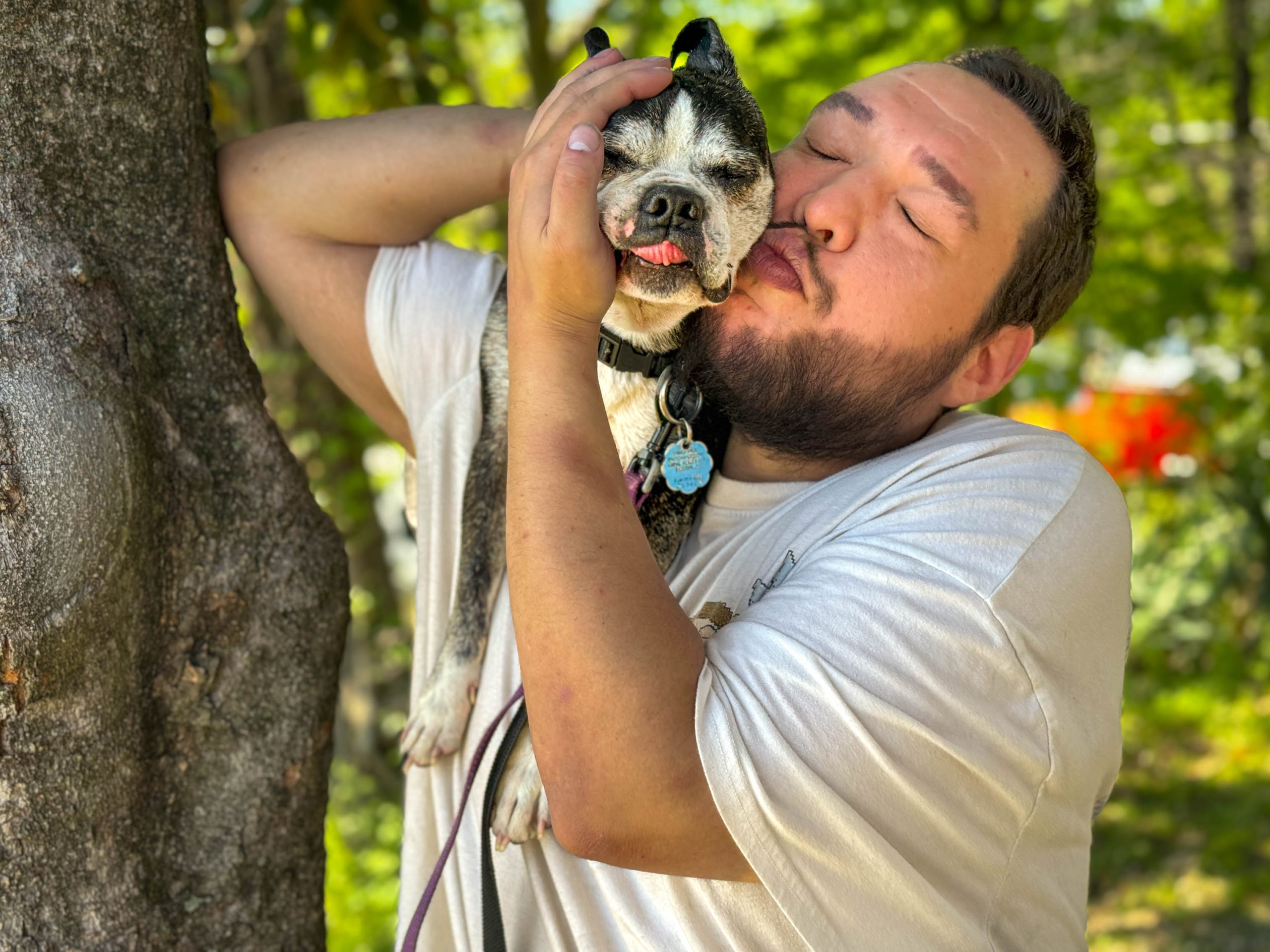 “This is Clyde. I call him Clydesdale. He’s eighty percent deaf and blind. We’re both in bad shape. I’m walking Clyde trying to condition my heart—working on what’s still good inside of our bodies. We’re fighting for each other.
