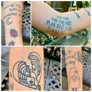 “The tattoo says, ‘Each of my teeth is a murdered king.’ It was a joke my boyfriend said because whenever your teeth die they get crowns put on them. David died six months ago and that joke was one of the first things I read that he wrote. It made me laugh and had to get it on my body, even if no one else gets the joke. He would have been 25 this year. He felt fine one day, the next day his body shut down. I also have a ghost tattoo because he is always with me. We dated for six years and were going to get married. He died in April and everything fell to the ground. I make art, and that has gotten me through this. He was an artist and brought me to where I am now. He lives inside me. We met working at Mellow Mushroom. We knew we met in a previous life and fell in love immediately. We moved to Arizona together because we had a friend in Tucson who said we could stay out there for a few weeks. We bought one-way tickets, packed three pairs of clothes, and lived there for a year. I am so glad we did that. I am taking a smaller step like that because I want to move to Mobile and spend more time on art. I feel like I belong here. I also sell vintage stuff on the side. I make curtains, paint, draw, weave, sculpt, and make jewelry.